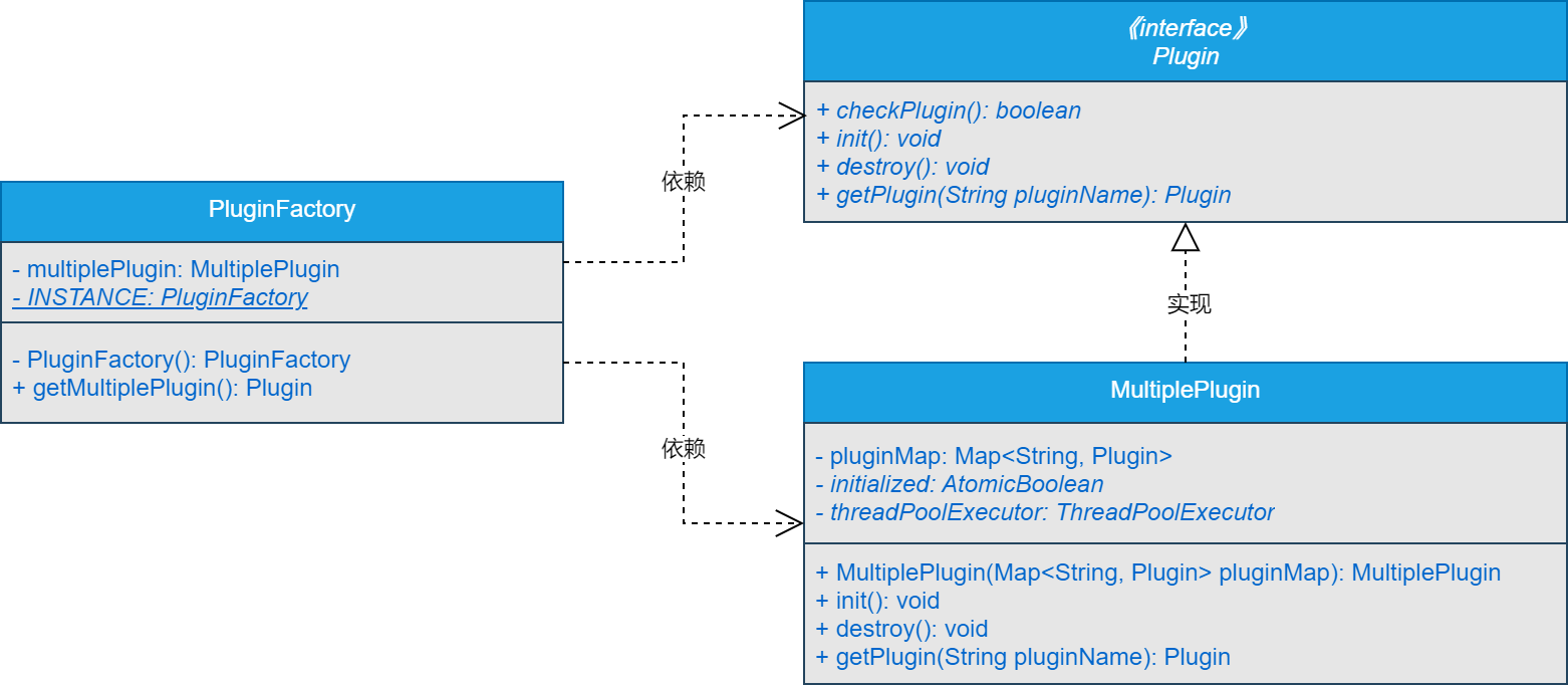 可以看到,在实现网关热插拔插件SPI接口与核心工厂类时,主要定义了Plugin接口,在Plugin接口中,定义了checkPlugin()方法、init()方法、destroy()方法和getPlugin()方法。并且MultiplePlugin类会实现Plugin接口,并实现Plugin中定义的方法。MultiplePlugin类中会管理多个通过SPI扩展实现Plugin接口的类。最后,实现了PluginFactory类,PluginFactory类会依赖Plugin接口和MultiplePlugin类,对外提供获取MultiplePlugin对象的方法。