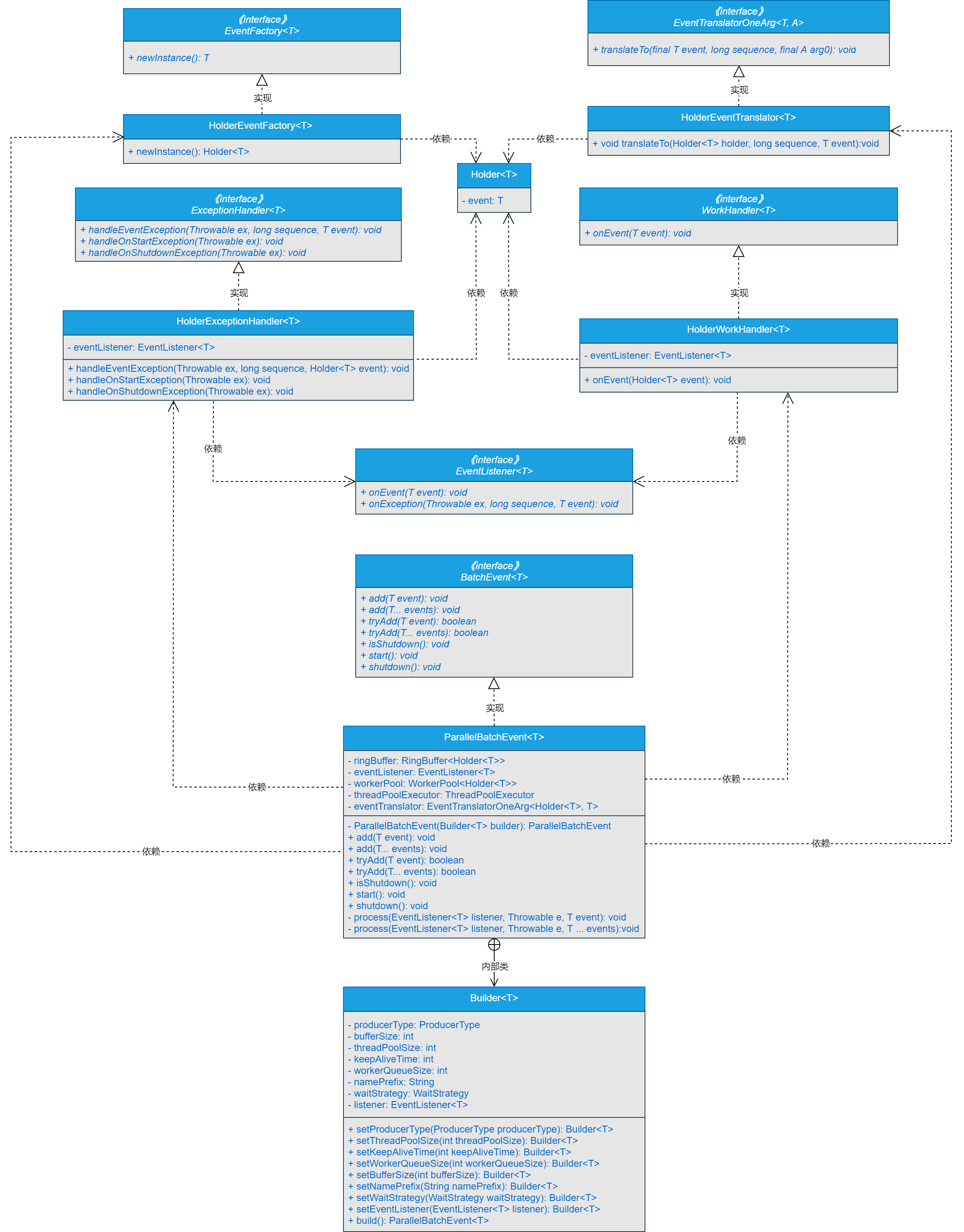 基于disruptor设计和实现BatchEvent模式的缓冲队列的核心类实现关系如图3-1所示。