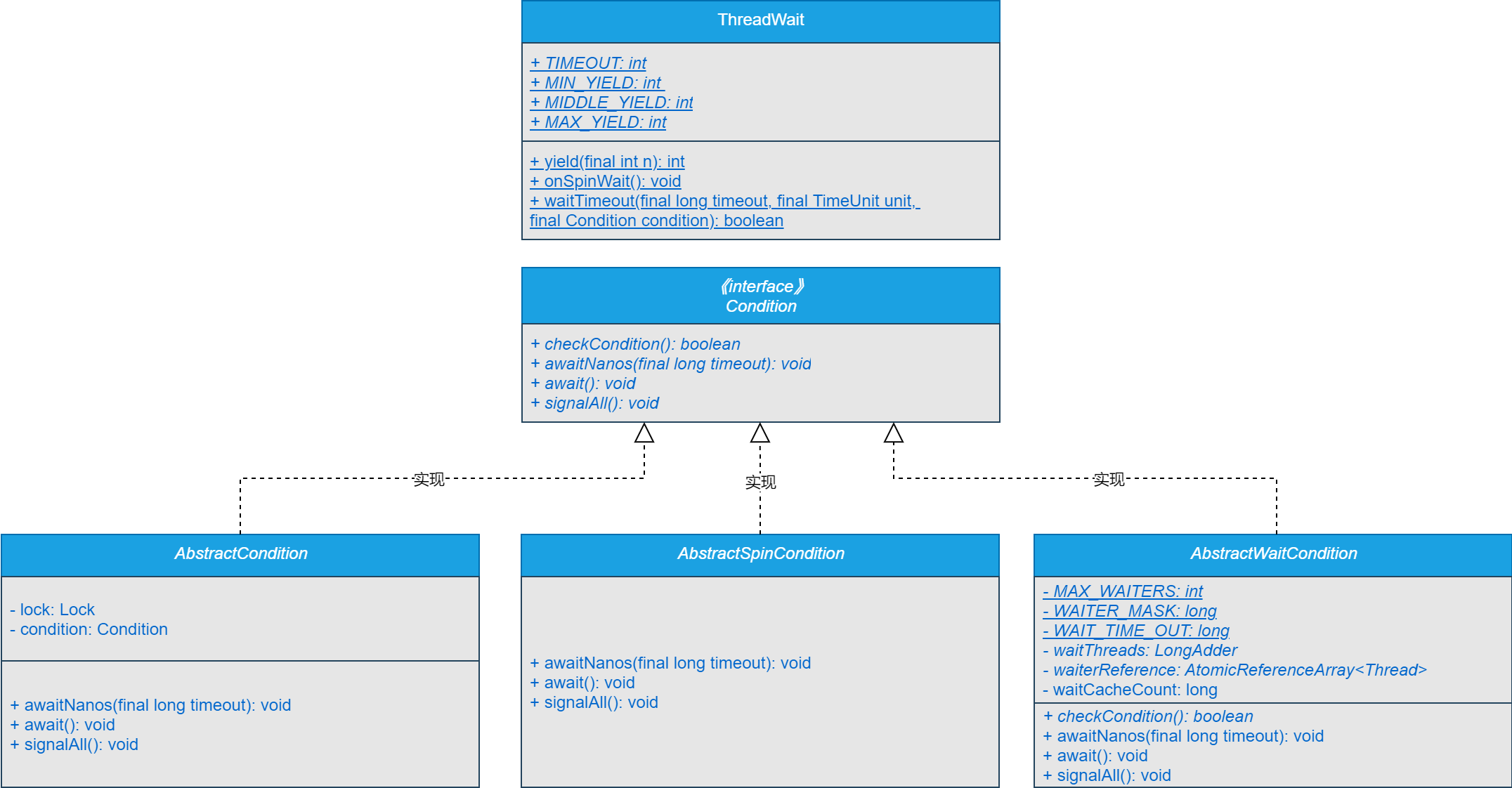 在设计和实现MPMC缓冲队列的过程中,已经对MPMC模式缓冲队列的Condition接口和ThreadWait类进行了设计和实现,并且对抽象Condition类和抽象自旋Condition类进行了设计和实现。接下来,就对抽象等待Condition进行设计和实现。