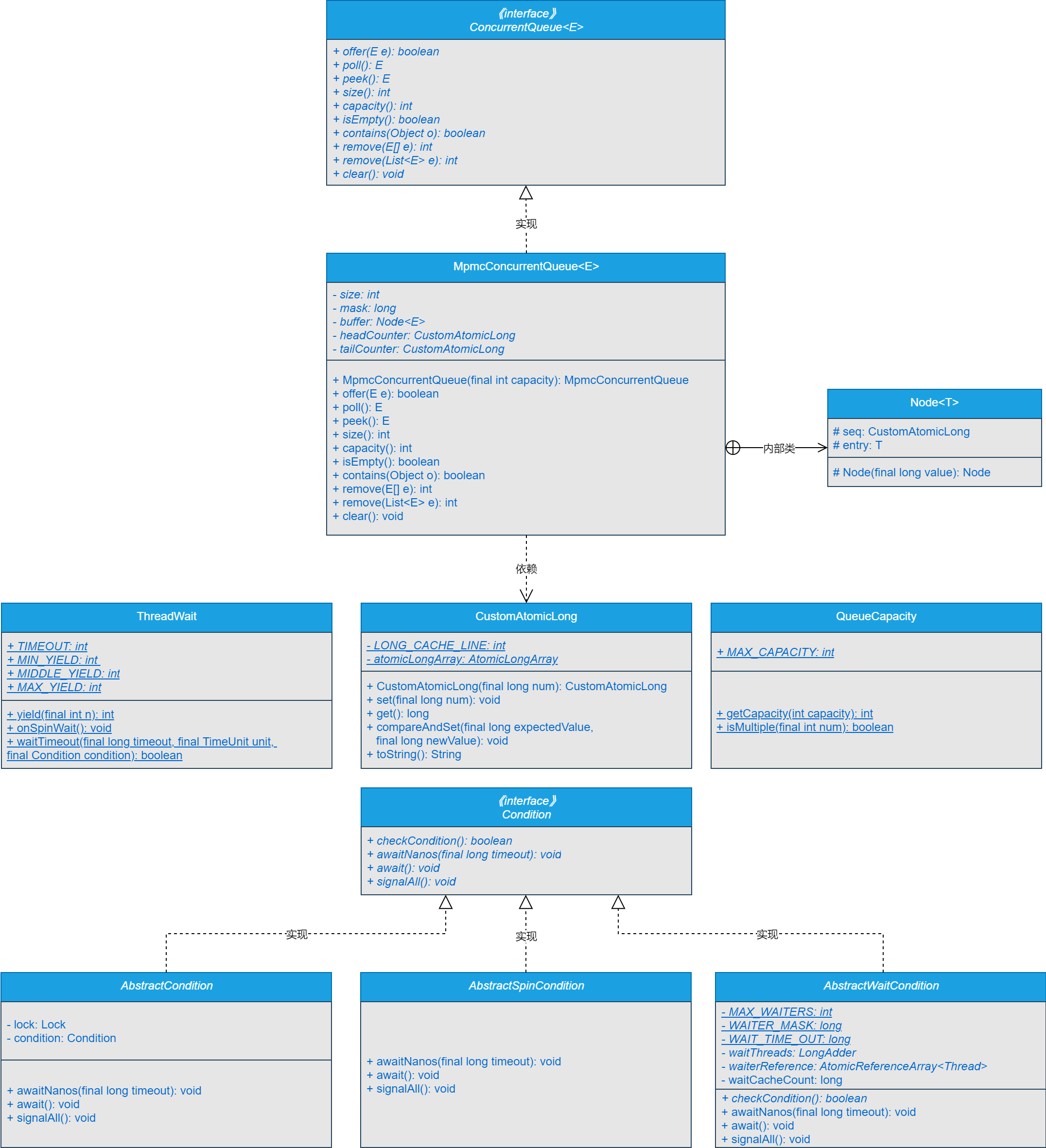 可以看到,并发环形队列主要由MpmcConcurrentQueue类实现,MpmcConcurrentQueue类会实现ConcurrentQueue接口,并且MpmcConcurrentQueue类中会定义内部类Node来封装实际要存储的数据。