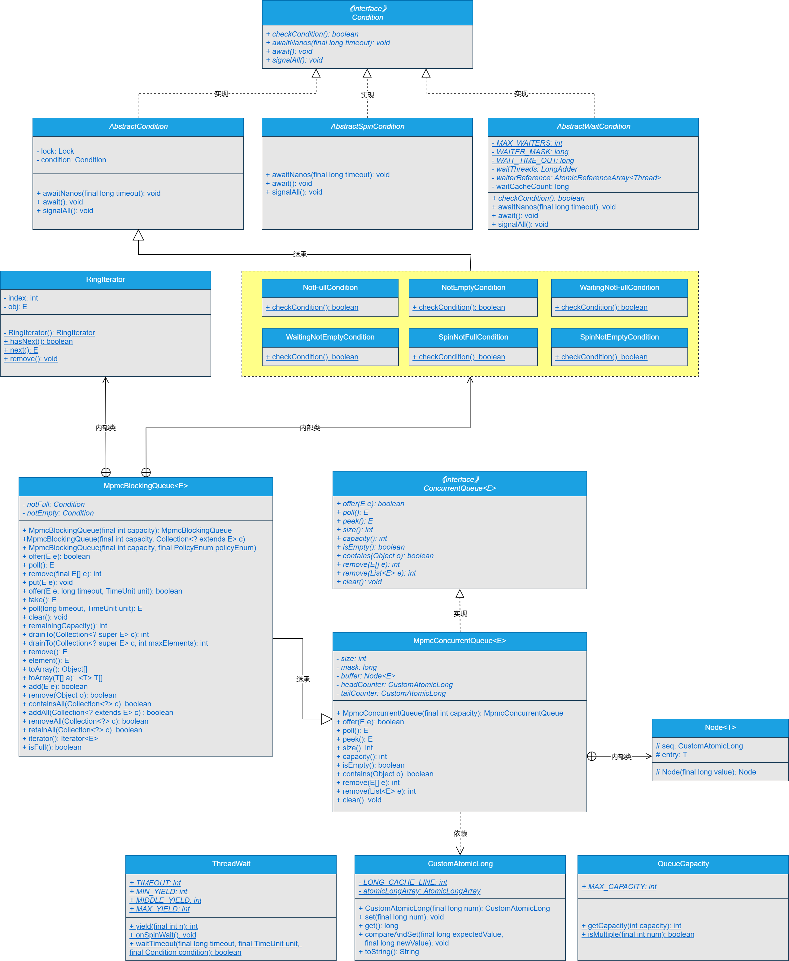 可以看到,并发阻塞队列主要由MpmcBlockingQueue类实现,MpmcBlockingQueue类继承了自定义并发环形队列MpmcConcurrentQueue类,实现了Queue、BlockingQueue、ConcurrentQueue、Iterable、Collection和Serializable等接口,并且在MpmcBlockingQueue类内部实现了多个内部类。
