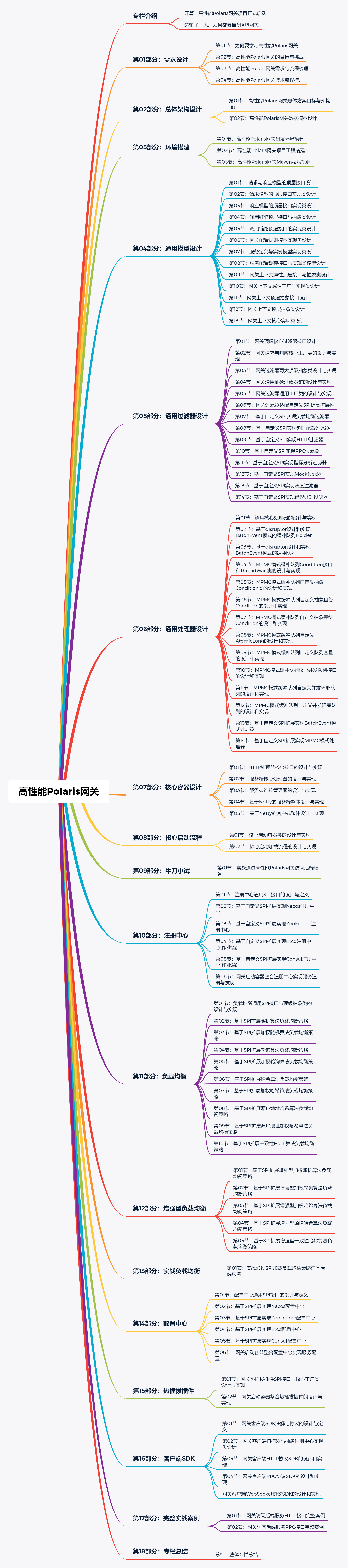 在整个《高性能Poalris网关》项目和专栏中,我们从需求设计、总体架构和环境搭建开始,一路带着大家对网关最基础和最核心的内容进行设计和编码实现。整体专栏内容如下所示。