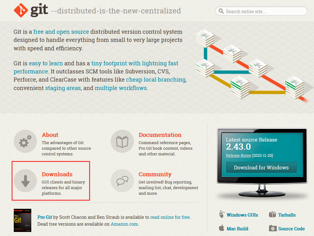 由于我们需要将代码工程推送到Gitcode,所以,需要安装git环境。git的官网是:https://git-scm.com (opens new window)。打开git官网后,点击“Downloads”按钮,如图2-1所示。
