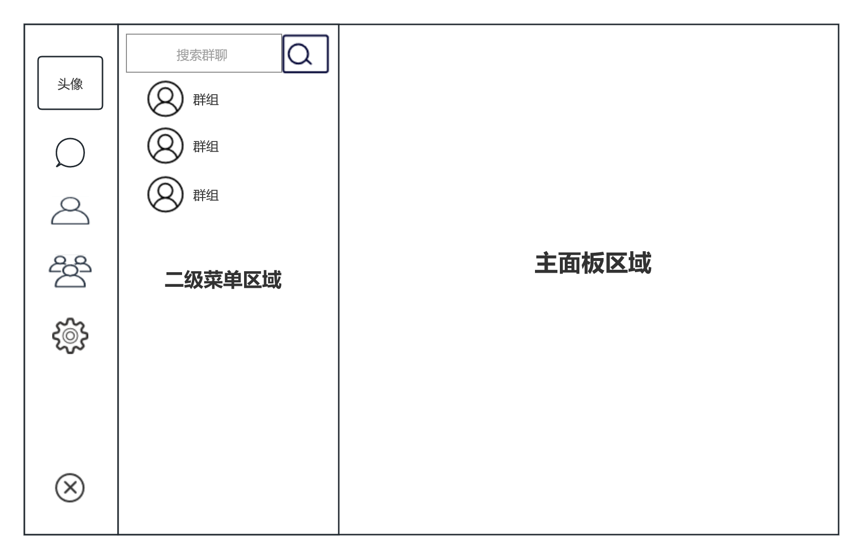 可以看到,群组主体页面的设计与好友主体页面的设计类似,总体上都会分成一级菜单区域,二级菜单区域和主面板区域,在二级菜单区域中,可以搜索群聊,展示创建和加入的群组列表,用户可以点击群组列表的某个群组,查看群组详情,并能够通过群组详情跳转到群聊页面。如果是自己创建的群组,也可以在群组详情页面解散群聊。