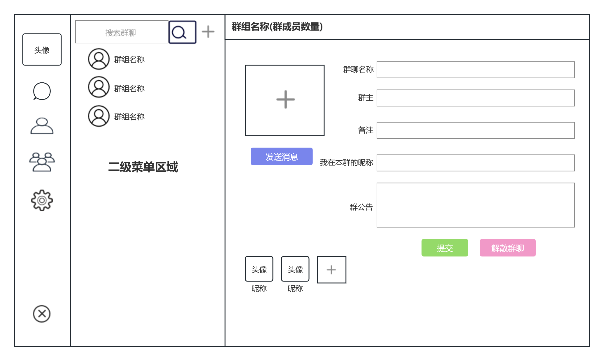 对于大前端UI的群组模块来说,我们已经设计和实现了群组的主体页面、创建群和修改群的流程,对邀请好友进群的流程和功能进行了设计和实现,并且对群主踢人和成员退群的流程进行了设计和实现。同时,对群主解散群组的流程和功能进行了设计和实现。接下来,就对群组模块发送群聊消息的流程进行设计和实现。