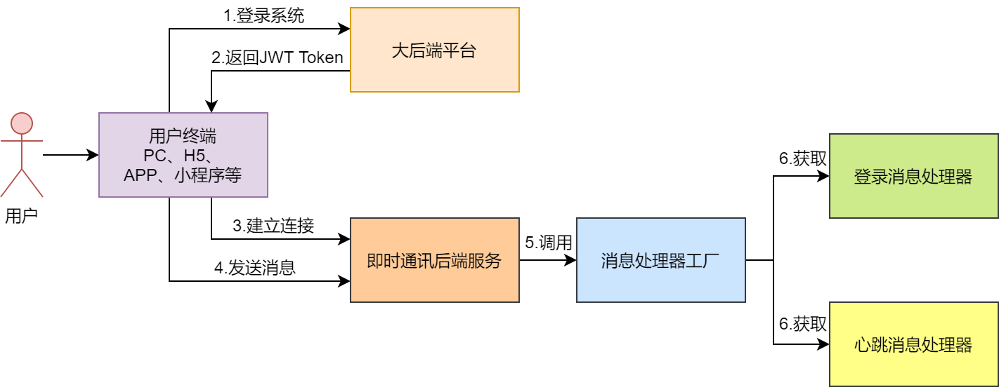 发送心跳消息的流程与发送登录消息的流程大体相似,都是即时通讯后端服务接收到消息后,调用消息处理器工厂的方法从IOC容器中获取对应的消息处理器,进而处理相应的消息。
