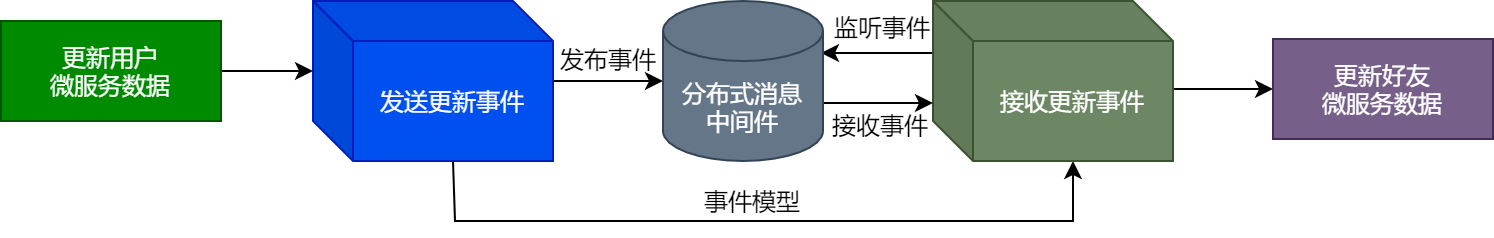 可以看到,整个流程本质上就是生产者和消费者模式,用户微服务作为生产者,当用户微服务更新完自身数据后,会发送更新事件到分布式消息中间件。而好友微服务作为消费者,监听分布式消息中间件中的数据,当接收到数据时,就会更新自身服务的数据。并且数据在用户微服务和好友微服务之间交互时,会以统一的事件模型进行交互。