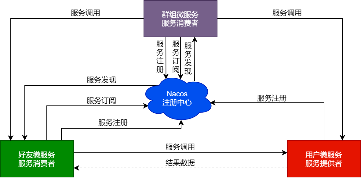 可以看到,群组微服务在整个大后端平台中,既作为服务提供者将服务注册到Nacos注册中心,供其他服务订阅。也会作为服务消费者订阅用户微服务和好友微服务注册到Nacos注册中心的接口,调用用户微服务的接口获取用户的基本信息,调用好友微服务的接口获取用户的好友消息。
