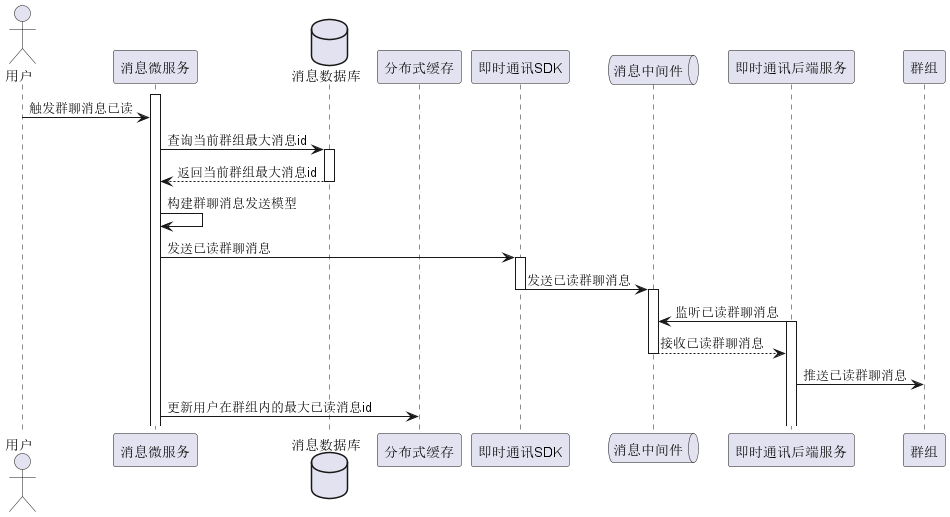 对于群聊消息的已读流程来说,与单聊消息的已读流程相比,还是有所差异的,单聊消息的已读流程中,如果好友接收到用户发送的消息,可以回调消息服务的接口来更新单聊消息的状态。但是在群聊消息的已读流程中,用户会将消息发送到群组中,此时会有多个用户接收消息,如果每个用户接收到消息都会更新消息状态,显示是不合理的。