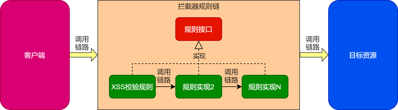 可以到,在拦截器规则链中新增具体的XSS校验规则后,整体执行流程不变,请求只有通过拦截器规则链中所有的校验规则后,才会将请求发往目标资源,只要有一个具体规则校验不通过,则不再将请求发往目标资源。