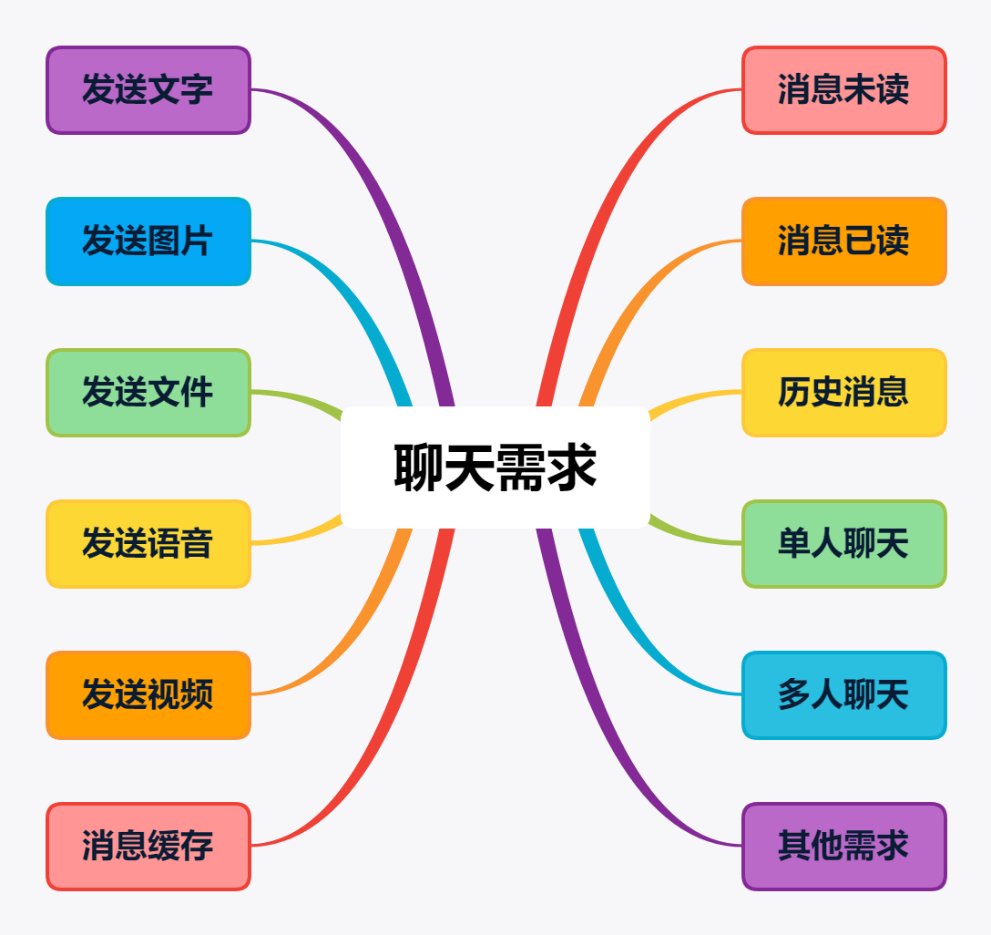 可以看到,针对聊天本身来说,最核心的需求就是:发送文字、图片、文件、语音、视频、消息缓存、消息未读、已读、撤回,历史消息、单聊、群聊,以及其他一些需求。