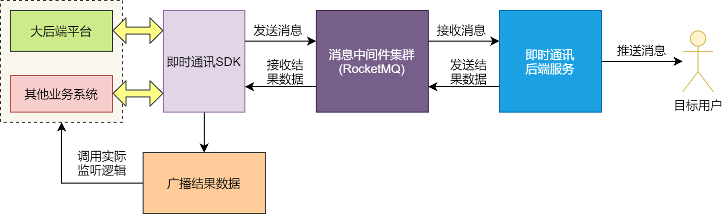 可以看到,即时通讯SDK发送向消息中间件发送消息后,会调用广播方法回传消息发送结果。即时通讯后端服务会监听消息中间件中的数据,接收到数据后,会将消息推送给目标用户。随后将消息推送结果发送给消息中间件集群,即时通讯SDK接收到发送的结果数据后,调用广播方法处理消息发送结果。在广播方法中,实际上会调用集成即时通讯SDK的大后端平台和其他业务系统中实现消息监听接口的具体实现类的方法来处理结果数据。