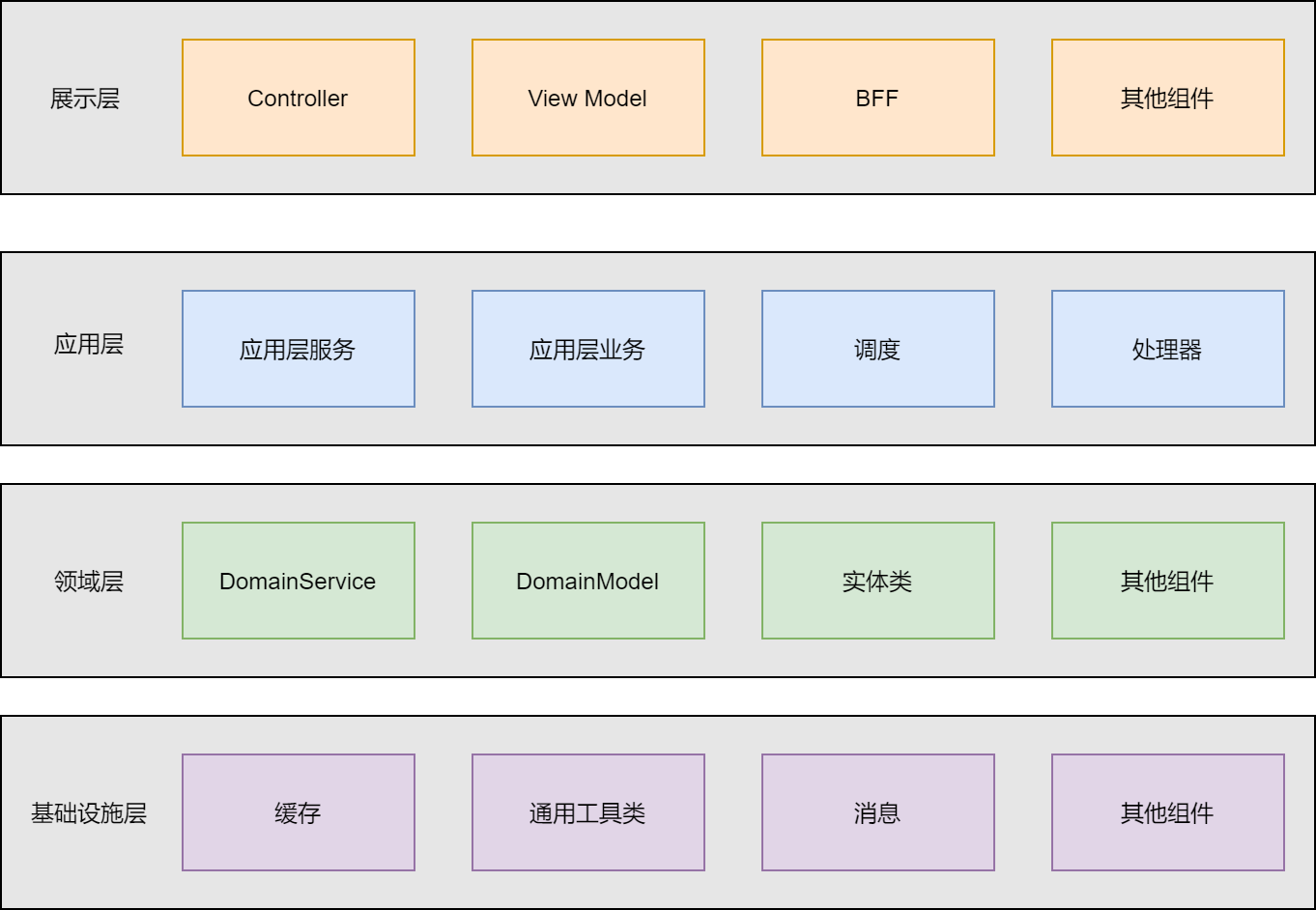 在分布式IM即时通讯系统中,不管是大后端平台,还是IM即时通讯服务,我们都会对业务层的代码采用分层业务架构,这里,可以借鉴DDD的分层架构思想,将代码总体上分成展示层、应用层、领域层和基础设施层四个层次,但是,考虑到分布式IM即时通讯系统的特殊性,又不会严格按照DDD的原则来设计代码分层,具体按照如图1-4所示。