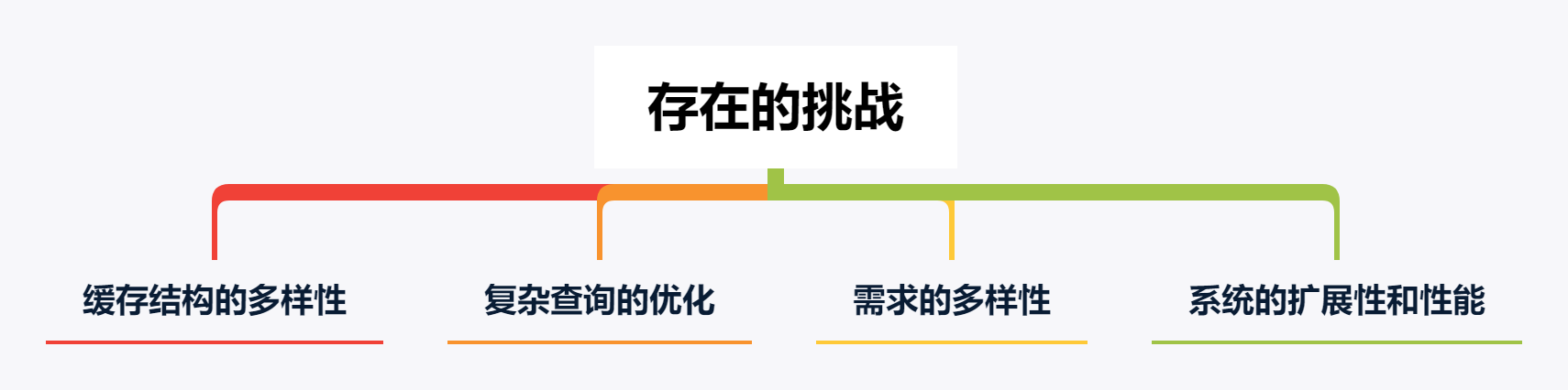 简单了解了高性能Redis组件的主要目标后,我们再来看看建设高性能Redis组件存在哪些技术挑战。总体上,可以从 缓存结构的多样性、复杂查询的优化、需求的多样性、系统的扩展性和性能 几个方面对存在的挑战进行说明。