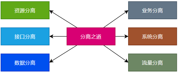 分离之道中,重点在于一个“分”字,主要包括:前后端资源分离、接口分离,数据分离、业务分离、系统分离、流量分离。