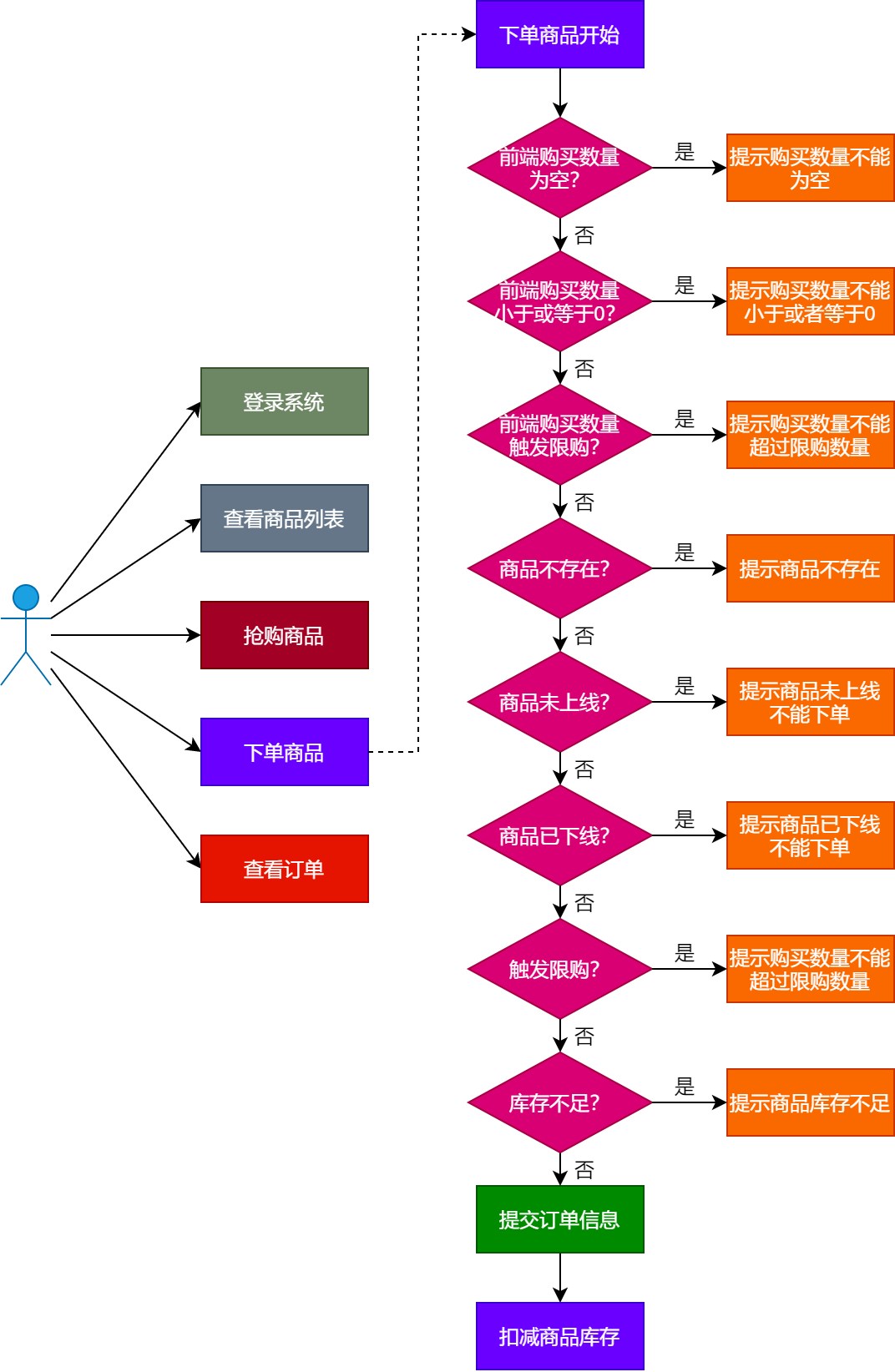 用户在登录秒杀系统后,在商品页面点击抢购,如果要抢购的商品符合抢购条件,则跳转到下单页面,填写要购买的商品数量,点击下单,就会触发用户下单的业务流程,简化后的流程如图23-1所示。
