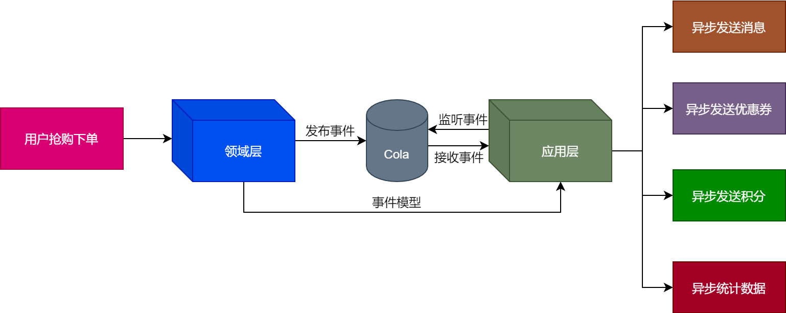可以看到,用户在秒杀系统中抢购下单成功后,领域层将订单事件封装成对应的事件模型发布到Cola,应用层会监听Cola中的事件,并且接收对应的事件,接收到事件后会进行诸如异步发送消息、异步发送优惠券、异步发送积分和异步统计数据等等的操作。
