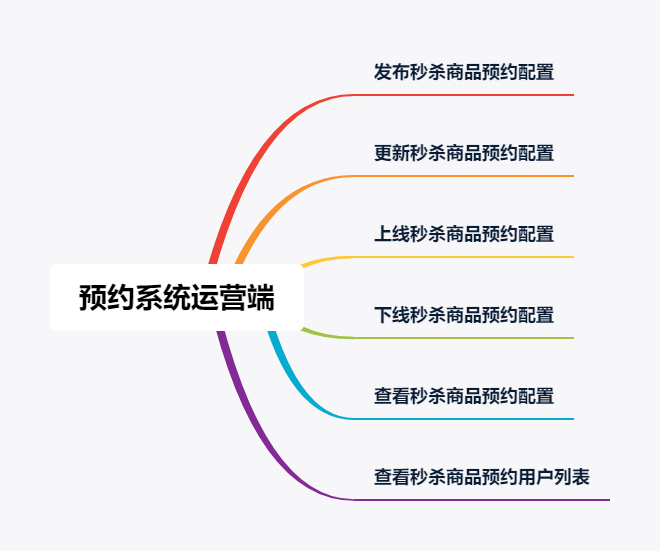 可以看到,运营人员可以在预约系统中发布秒杀商品的预约配置、更新秒杀商品的预约配置、上线和下线秒杀商品的预约配置、查看秒杀商品的预约配置和查看秒杀商品预约用户列表。