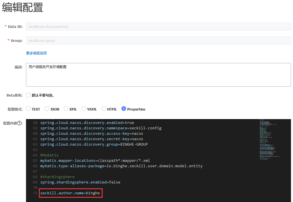 在Nacos中修改seckill-user-dev.properties的配置,在seckill-user-dev.properties配置中新增配置项seckill.author.name=binghe,如图100-1所示。