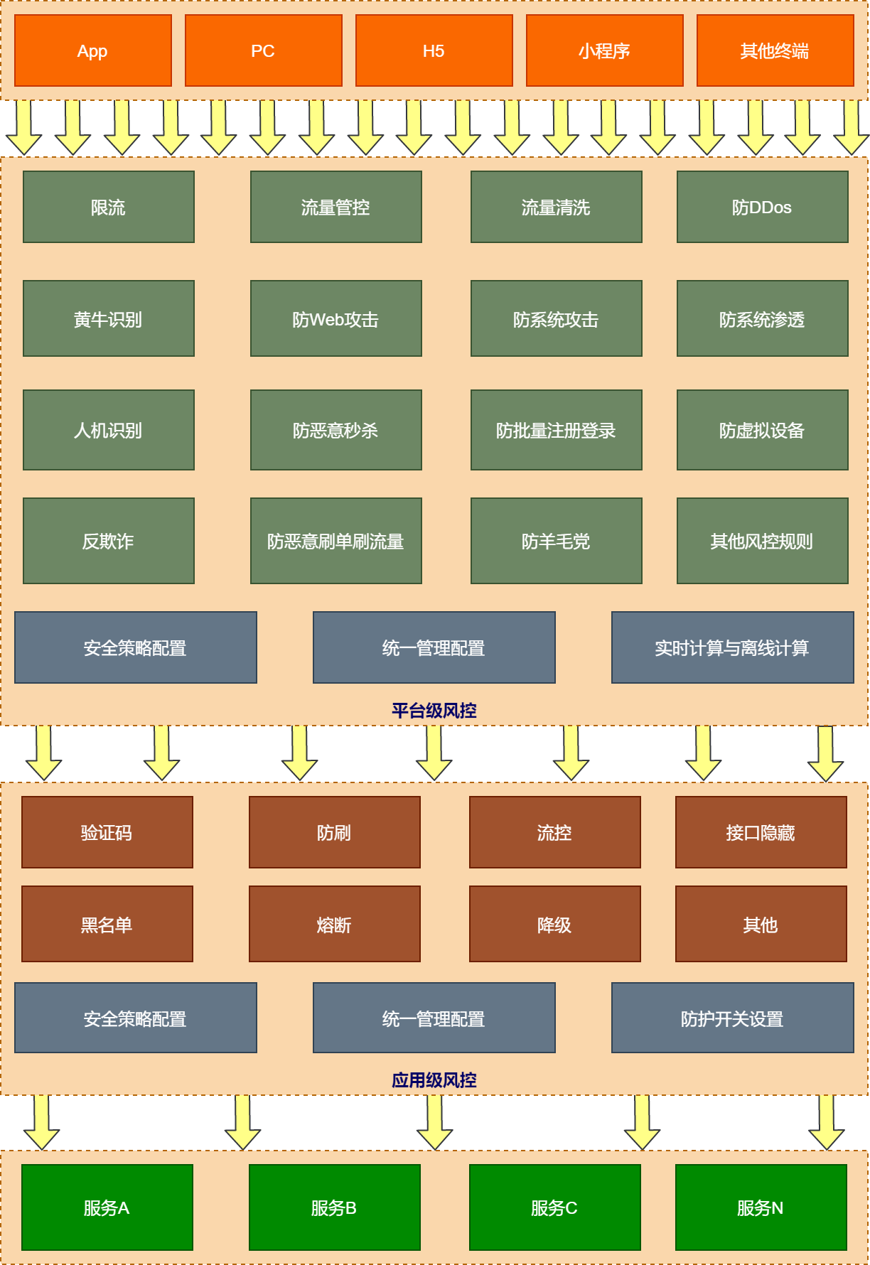 可以看到,平台级风控安全防护位于客户端与应用之间,会对进入系统的流量进行拦截和清洗,过滤掉其中的攻击流量、刷单流量、爬虫和其他恶意流量。流量进入平台级风控后,会根据配置选择对应的风控策略,执行相应的风控逻辑,例如限流、防恶意刷单刷流量等,执行完对应的风控策略后,会根据配置选择对应的结果处理方式,例如通过请求、拒绝请求、需要安全校验等等,涉及到安全校验时,可能需要手机号验证,人机验证码等等。