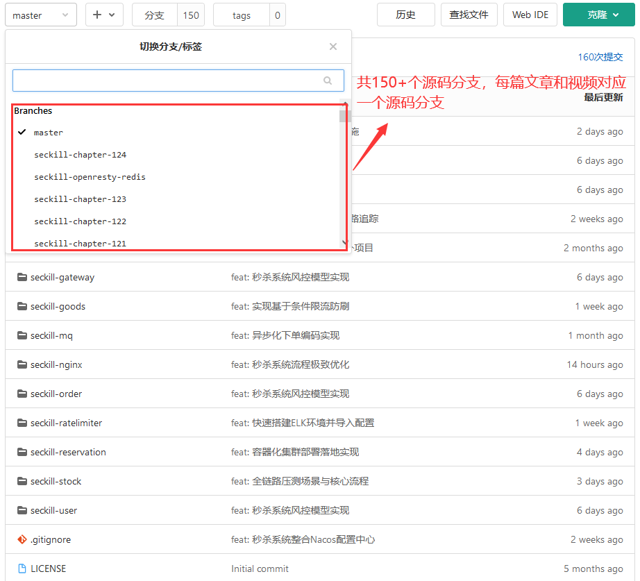4.代码结构:master分支是最新的全量代码,专栏中每一章都会对应一个代码分支,切换到章节对应的代码分支后,即可根据当前章节学习对应的代码实现,不然,在master分支中看到的是全量的代码。