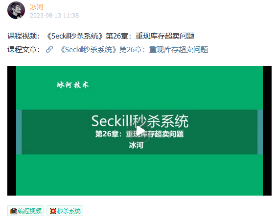 6.冰河也在为《Seckill秒杀系统》专栏录制完整的视频课程。