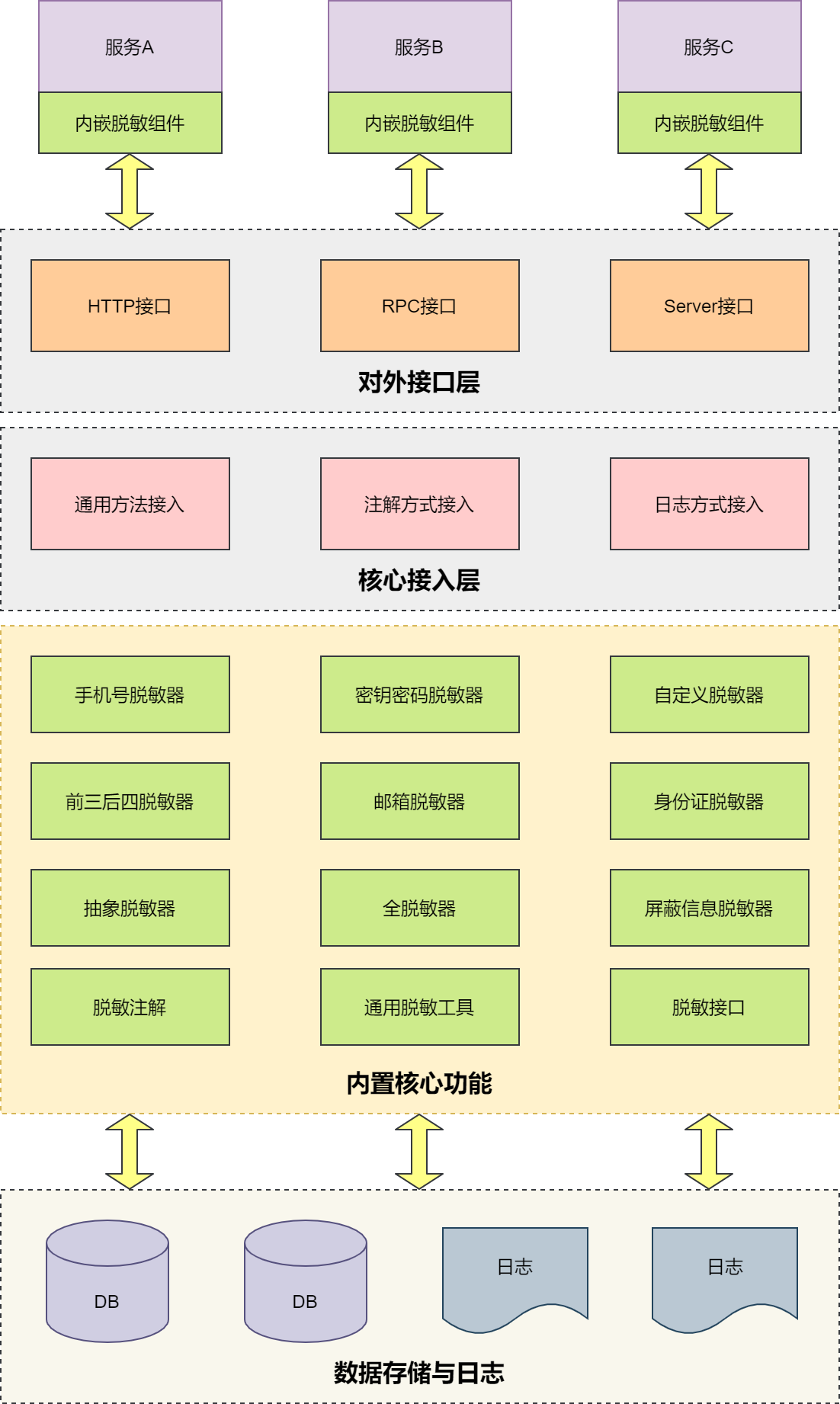 嵌入式方案:将高性能脱敏组件打包成SDK嵌入到各个服务内部,通过通用方法、注解和日志快速接入高性能脱敏组件。