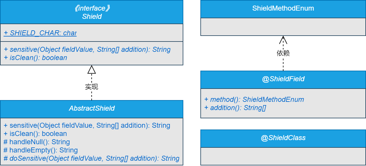 可以看到,在设计高性能脱敏组件时,@ShieldClass和@ShieldField为高性能脱敏组件的注解,并且@ShieldFiled注解依赖SheldMethodEnum枚举。同时定义了高性能组件的脱敏接口为Shield,顶层脱敏抽象类为AbstractShield。具体说明如下: