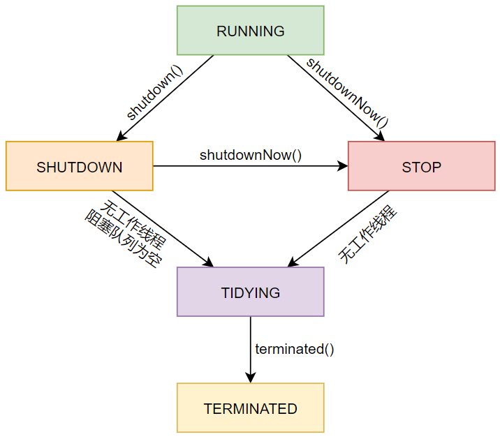 线程池在运行的过程中,其内部维护的状态变量的值不是一成不变的,而是会随着某些事件的触发而动态变化,线程池核心状态的流转过程如图1-1所示。