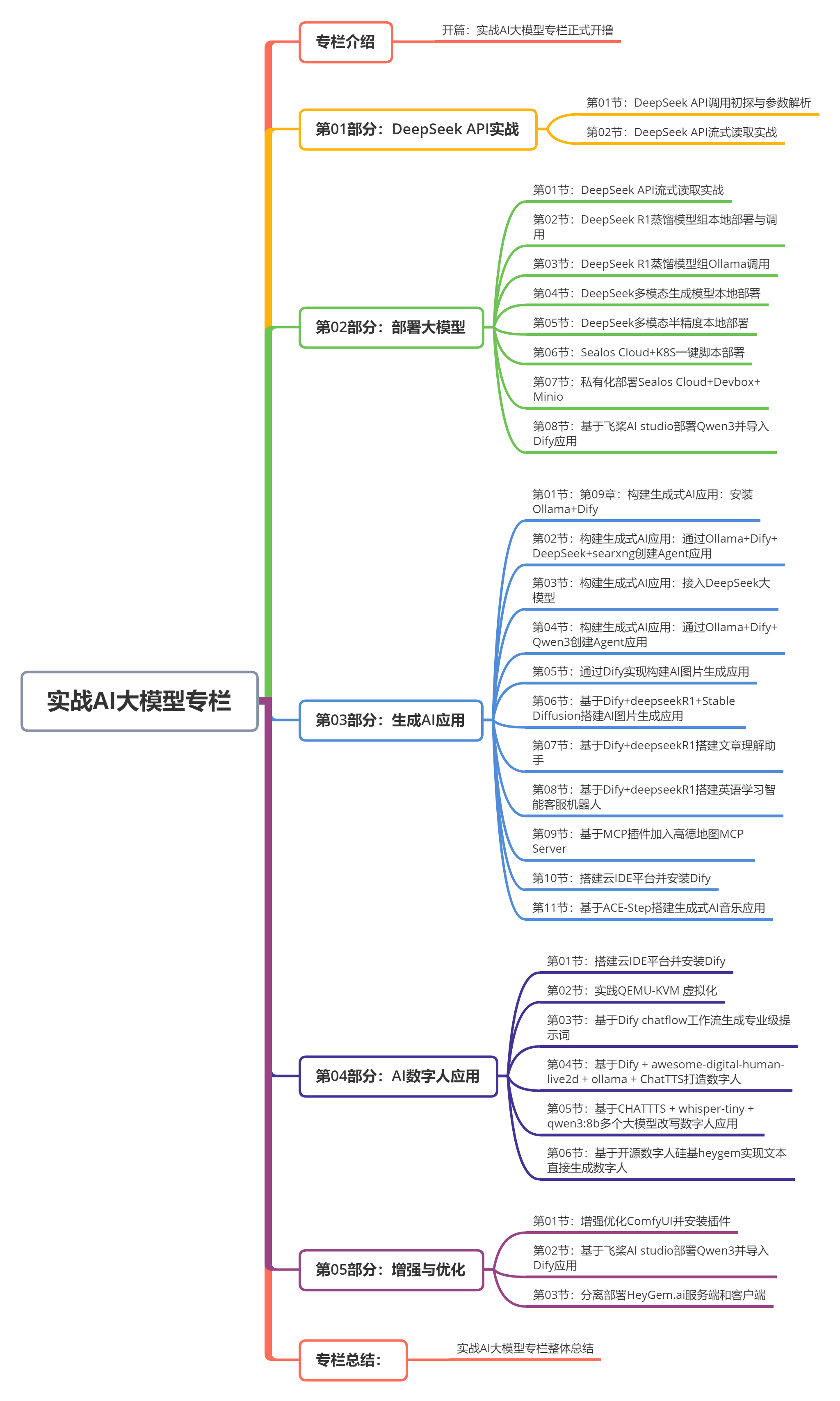 为了大家能够更好的学习和理解《实战AI大模型》专栏,我们会将整体专栏分成几部分,大致分成:专栏介绍、DeepSeek API实战、部署大模型、生成AI应用、AI数字人应用和增强与优化等。大致的专栏提纲如下所示。